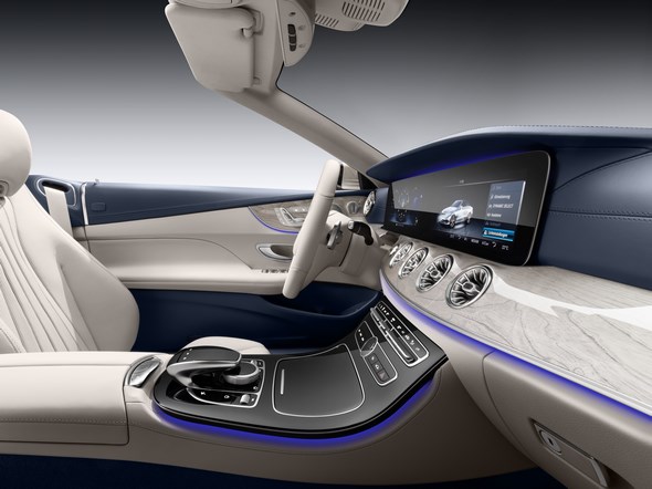 The interior of the new E-Class Cabriolet has a clear basic form. The upper section of the dashboard appears to be hovering and rests against generously proportioned trim elements which flow sensuously into the front doors.