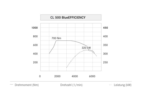 12 percent more powerful than its predecessor, which had an output of 285 kW (388 hp). At the same time, torque was raised from 530 Nm to an impressive 700 Nm – an increase of 32 percent. Combined consumption in the New European Driving Cycle (NEDC), on the other hand, drops by around 22 percent in the CL 500 BlueEFFICIENCY to 9.5 litres of premium petrol per 100 kilometres. CO2 emissions sink from 288 to 224 grams per kilometre.