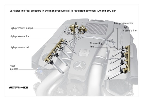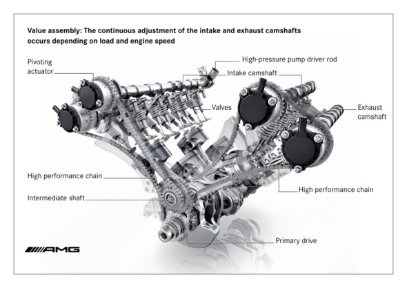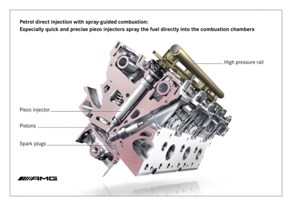 Mercedes-AMG is presenting an attractive high-tech package with its combination of biturbocharging and direct petrol injection with spray-guided combustion. The innovative injection technology brings decisive advantages with respect to fuel consumption and exhaust emissions, thanks to higher thermodynamic efficiency. Particularly fast and precise piezo-electric injectors spray the fuel directly into the combustion chambers, ensuring a homogenous fuel/air mixture and highly effective combustion.