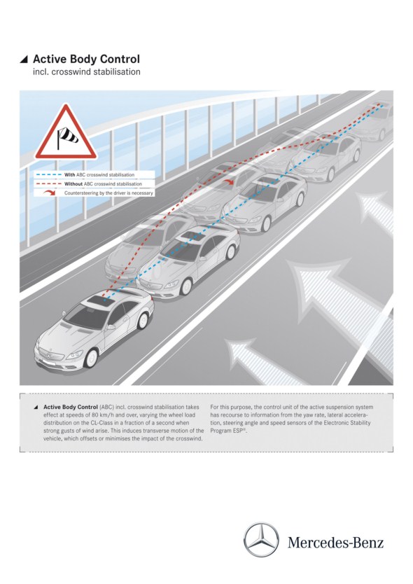 Handling dynamics and active driving safety are further improved by the Direct-Steer system, with variable ratio depending on steering angle, and the modified active suspension Active Body Control (ABC) with crosswind stabilisation. Like the Torque Vectoring Brake – targeted, one-sided braking intervention at the inside rear wheel when cornering, which enables the car to turn into the bend with even greater agility – both features also are familiar from the S-Class.