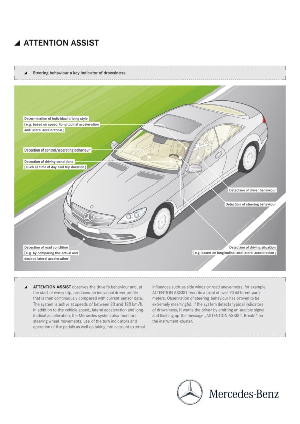Mercedes-Benz has also improved the long and medium-range radar used by the Brake Assist System PLUS (BAS) PLUS and the DISTRONIC PLUS proximity control in the CL. From the S-Class the large Mercedes coupé also gets the ATTENTION ASSIST drowsiness detector.