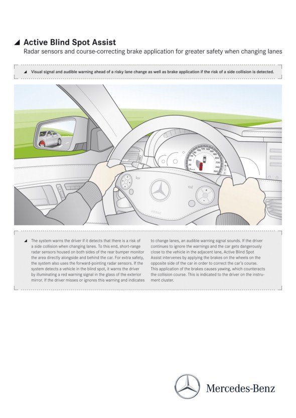Also new is the Active Blind Spot Assist, which warns the driver by displaying a red warning in the glass of the relevant exterior mirror when it detects that changing lanes would be too dangerous. If the driver ignores the warnings and comes dangerously close to a vehicle in the neighbouring lane, a novel feature of the system acts: a corrective braking intervention via ESP® on the wheels of the opposite side of the vehicle.