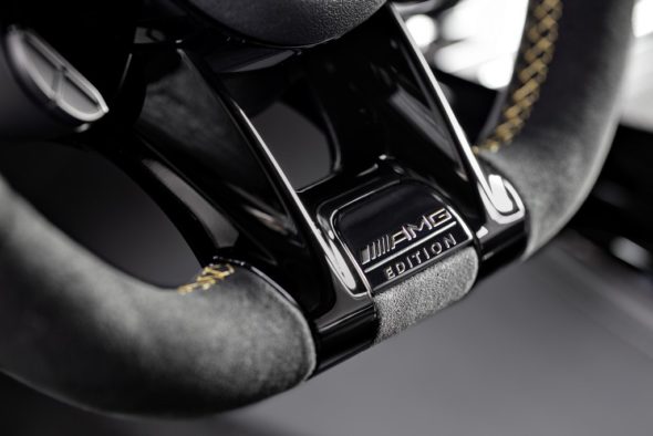 AMG Performance steering wheel in DINAMICA microfibre with yellow contrasting topstitching, yellow 12 o’clock marking and “Edition 1” badge, steering wheel bezel including control buttons and AMG shift paddles in black chrome, additional AMG switches on steering wheel