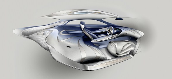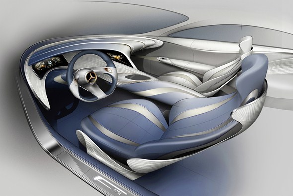 The centre console formally emerges from the dashboard and curves around the driver. The large star in the steering wheel forms the central core from which three wide, wooden spokes extend. The generous interior dimensions are similar to those of a current long-wheelbase S-Class, though the exterior dimensions are more akin to the E-Class.