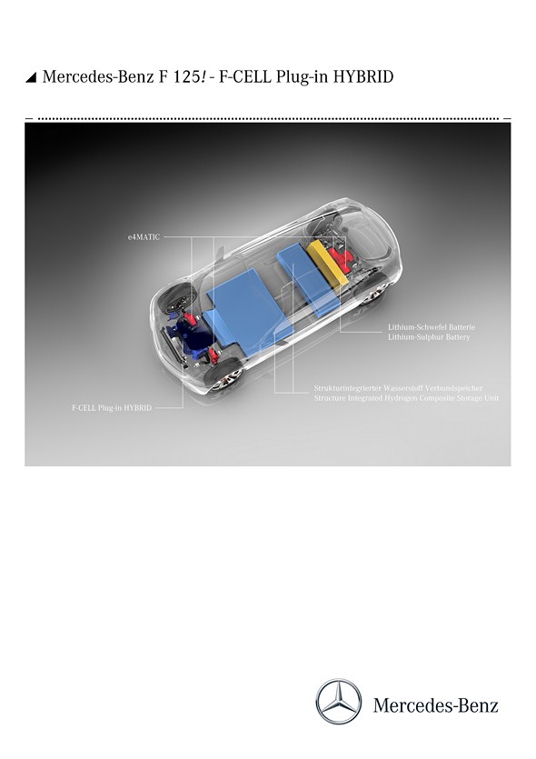 With the new Mercedes-Benz research vehicle, the vision of emission-free driving with large, luxurious automobiles takes on a concrete form. The F 125! shows that the mobility of the future is emission-free and sustainable, comfortable and visually very appealing. It embodies technical and design innovation, and shows the way towards a society able to cope without fossil fuels.