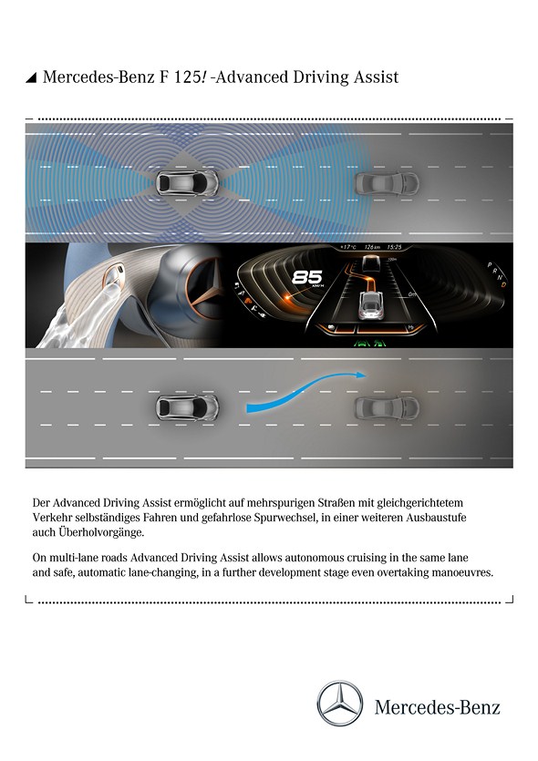 In the process the F 125! controls both the linear and lateral vehicle movements, while its sensors “keep an eye on” other road users at all times. The driver merely needs to give the relevant command, leave his hands loosely on the steering wheel, lean back and relax. Naturally he is able to take back full control of the car at any time.