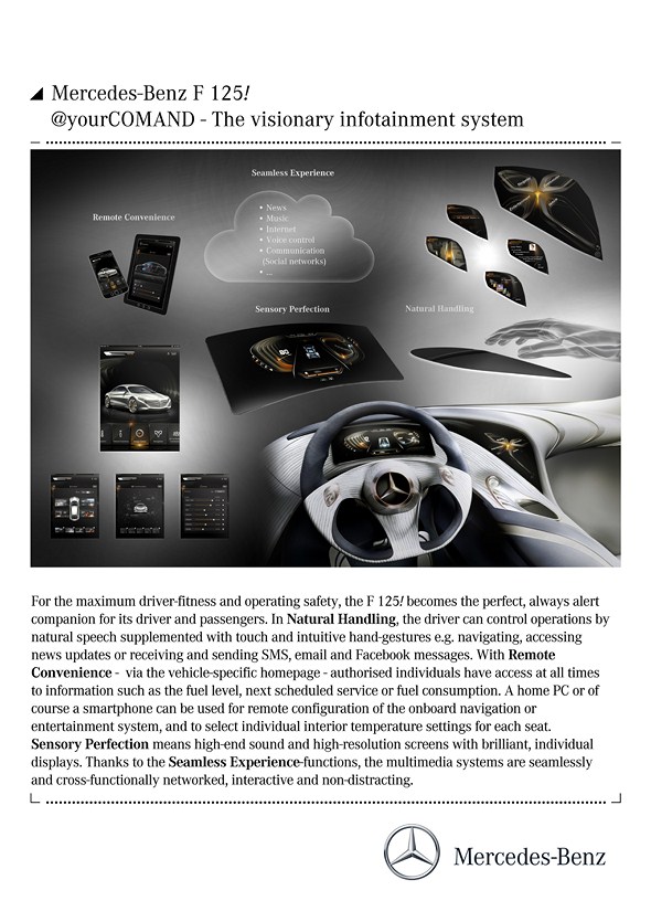 With the visionary infotainment system “@yourCOMAND”, the F 125! provides an outlook on future Mercedes-Benz telematic systems. Its trailblazing features include:
