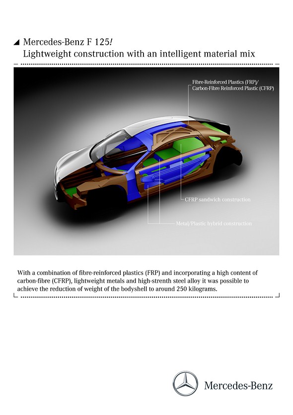 - A bodyshell of innovative, lightweight hybrid construction with a high proportion of fibre-reinforced plastics and an intelligent mix of carbon-fibre, aluminium and high-strength steels, which allows a significant weight reduction while offering a further considerable improvement in safety. A high-strength construction with crash-responsive protective systems within the doors allows the omission of B-pillars, as well as the use of wide gull-wing doors which allow convenient access to the four seats. In this way the Mercedes-Benz safety philosophy and in particular the decisive principle of the rigid passenger cell developed by Béla Barényi in 1952 are being concertedly taken forward for the future of individual mobility.