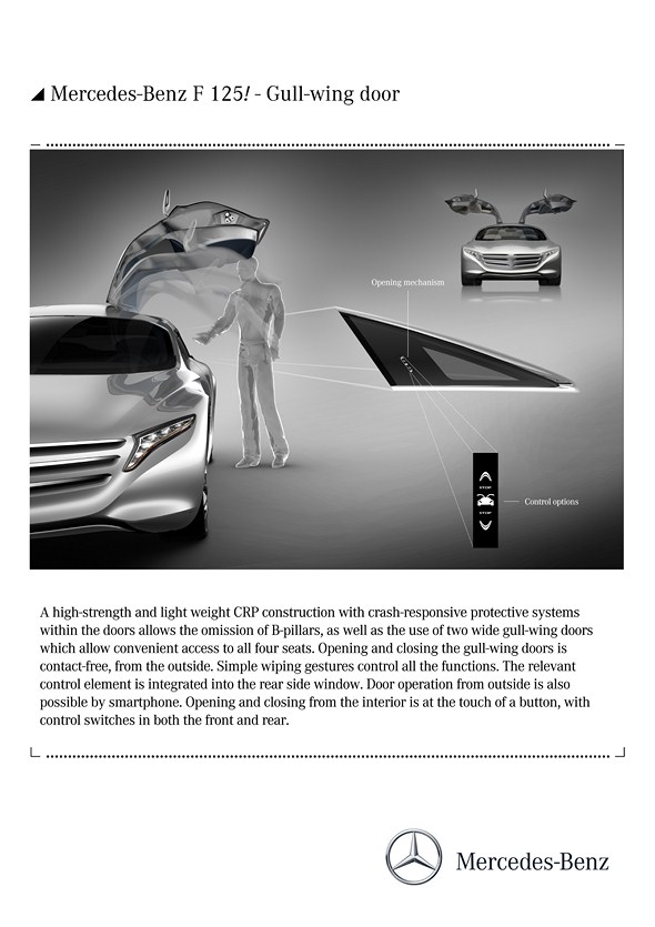 - A control and display concept based on touch, speech and hand-gestures makes the F 125! a true “companion” with whom the driver is able to interact flexibly and effortlessly. The gull-wing doors of light-weight CRP construction can also be opened and closed by hand-gestures.