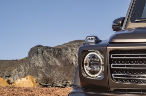 The G-Class, the luxury off-road vehicle from Mercedes-Benz, has long been considered a design icon. Its external appearance has not changed significantly since 1979. Iconic elements continue to serve very specific purposes, now as then, and to give the G-Class its unique appearance. All these are still found in the new G-Class: the distinctive door handle and the characteristic closing sound, the robust exterior protective strip, the exposed spare wheel on the rear door and the prominent indicator lights. Extraordinary features like these in concert with the off-roader’s angular lines define its special look.