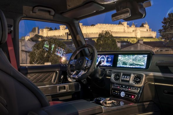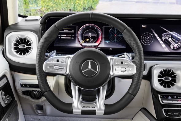 The very clearly arranged and completely redesigned instrument panel features timeless tube-look analogue round dials as standard. In other words, fans of classic round instruments will certainly not be disappointed in the new G-Class. As in the new E-Class and S-Class, an instrument cluster in the form of a large display showing virtual instruments in the driver’s direct field of vision and a central display above the centre console is available as an option. In this case the two 12.3-inch displays blend visually into a Widescreen Cockpit beneath a shared glass cover. Drivers can choose between three different styles for the displays – “Classic”, “Sporty” and “Progressive” – and also select relevant information and views according to their individual needs.