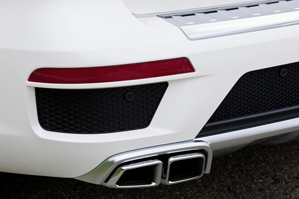 From the side, observers will notice the V8 BITURBO logos on the wings and illuminated running boards with an aluminium finish. The rear wheel-arch flaring blends into the AMG rear apron which is again adorned with a striking trim insert in matt silver chrome and the suggestion of black air openings. Creating both a visual and acoustic highlight are the two chrome-plated, exposed twin tailpipes of the AMG sports exhaust system.