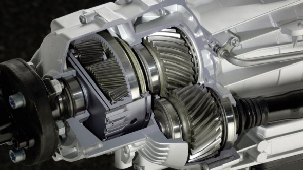 The 4MATIC transfer case, featuring a planetary centre differential and a pair of bevel gears acting as a lateral output to the front axle, is integrated into the 7G-TRONIC PUS automatic transmission that always comes as standard on the 4MATIC models. The centre differential produces the 45:55 torque split between the front and rear axles that has the aforementioned positive impact on handling stability and traction.