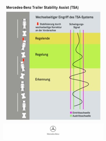 TSA is an extra function of the ESP® Electronic Stability Program and shares its sensory system; no additional electronics are required for either the trailer or the trailer coupling. TSA works as follows: the sideways movements of the destabilised trailer are transmitted to the vehicle towing it, which in turn starts to swerve from side to side.