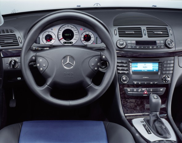 The leather, which also trims the door panels, is available in three different colour combinations. The three round instrument displays in the E 55 AMG are distinguished from those of the other E-Class models by new dials with the V8 KOMPRESSOR and AMG logos, and the speedometer gauge which extends to 320 km/h.