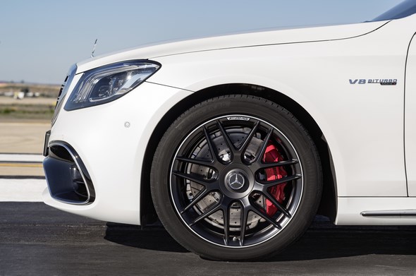 The S 63 4MATIC+ and S 65 are fitted with compound brake rotors of size 390 x 36 mm with 6-piston aluminium fixed callipers on the front axle, and of size 360 x 24 mm with single-piston floating callipers on the rear axle.